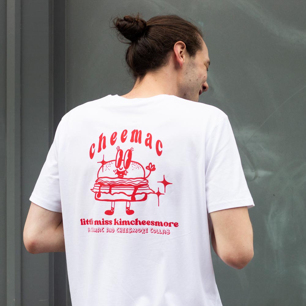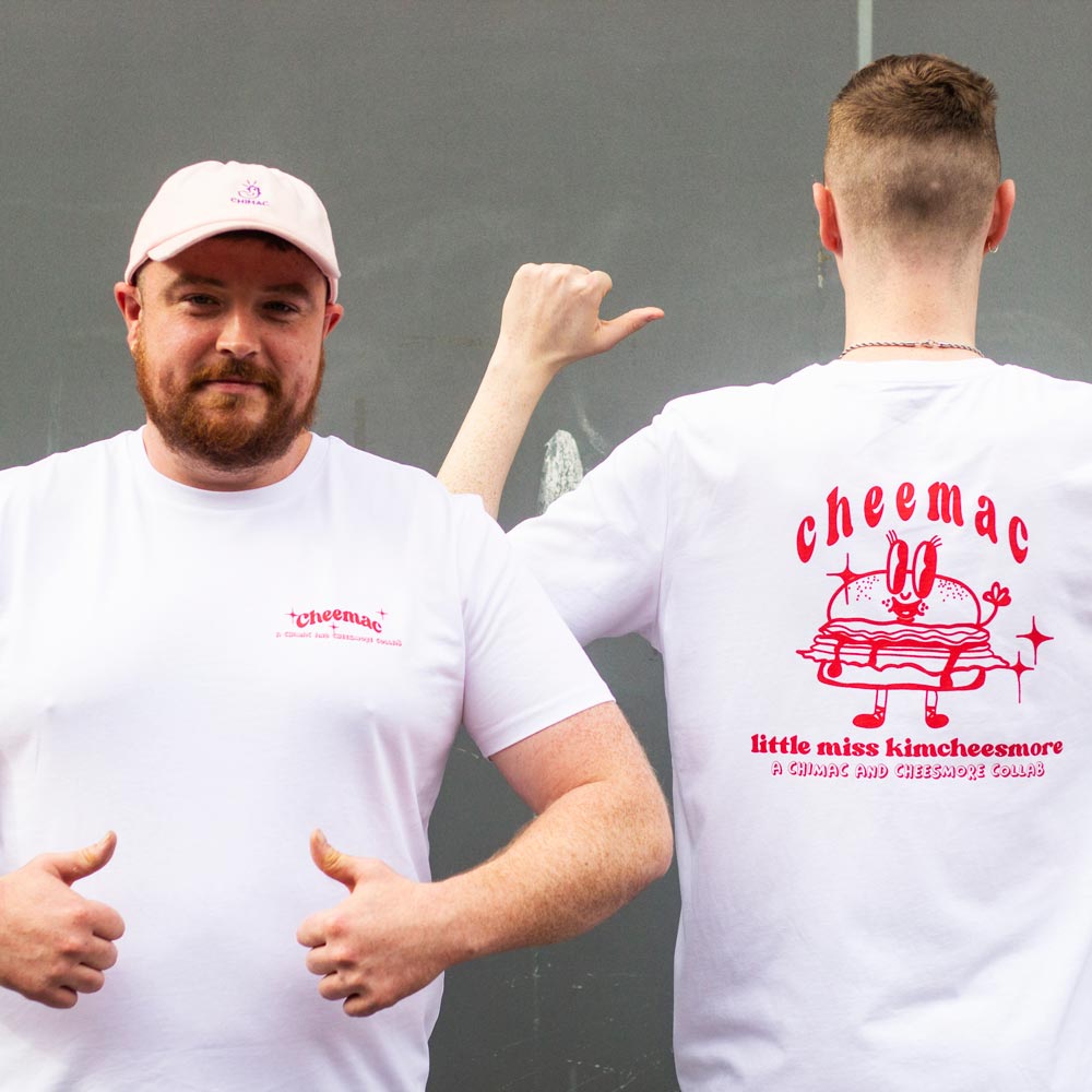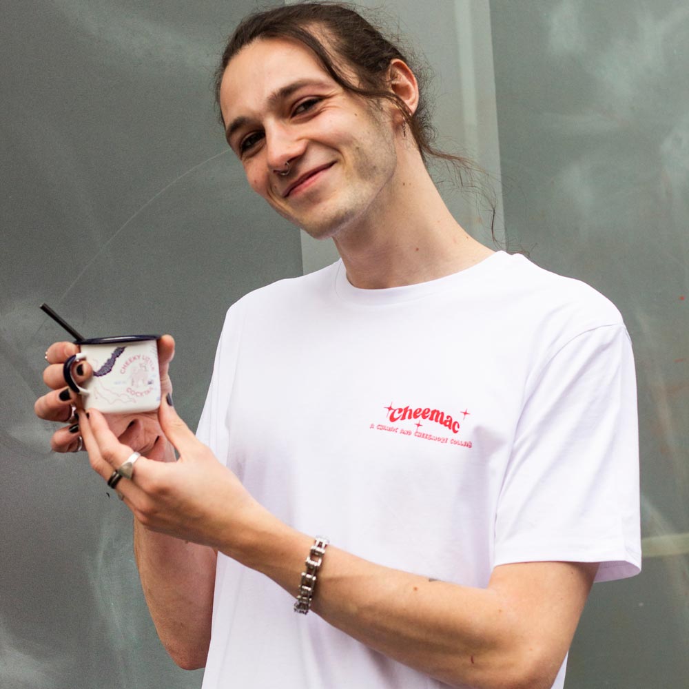 “Home Jab” - or Sara, is a tattoo artist based in Dublin. Tattooing for just over a year, she works mainly with a mixed medium of single-needle machine and handpoke shading. Her work is often influenced by interiors, old collectibles and embroidered designs made to look like rough sketchbook sketches. However, whilst her tattoo designs remain delicate and often draft-like, her approach to the ‘Chimac x Cheesmore’ collab sees her love for bold illustrative elements with an emphasis on typographic design.